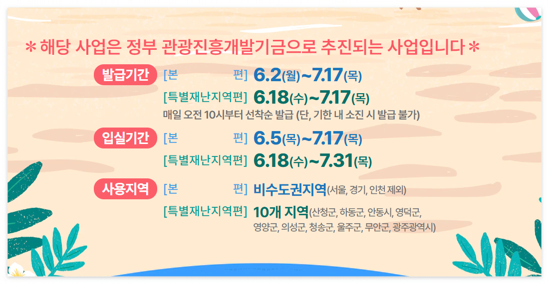 올해는 전국 규모로 진행되는 것은 물론, 특별재난지역 주민과 여행객을 위한 추가 할인 혜택까지 마련되어 있어, 국내여행을 더 알뜰하고 의미 있게 즐길 수 있는 절호의 기회입니다.