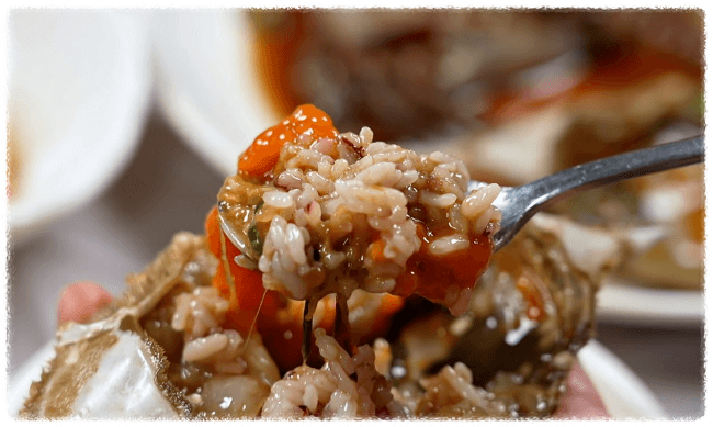 간장게장을 맛있게 즐기는 꿀팁은 바로 게딱지 비빔밥입니다! 내장이 가득한 게딱지에 따끈한 흰밥을 넣고 쓱쓱 비벼 보세요.