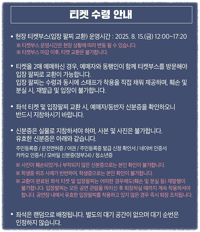 - 티켓 수령: 신분증 + 모바일 티켓 제시 → 입장 팔찌 수령