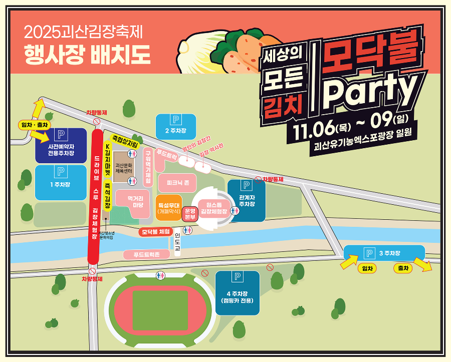 괴산은 절임배추의 본고장답게 매년 11월이면 김장문화의 중심지가 됩니다. 2025년에도 어김없이 열리는 이번 김장축제는 ‘세상의 모든 김치 X 모닥불 파티’라는 주제로 펼쳐져요. 괴산유기농엑스포광장에서 진행되는 이 축제는 단순한 김치 담그기를 넘어, 전통과 현대가 어우러지는 진정한 문화체험 축제로 자리 잡고 있습니다.